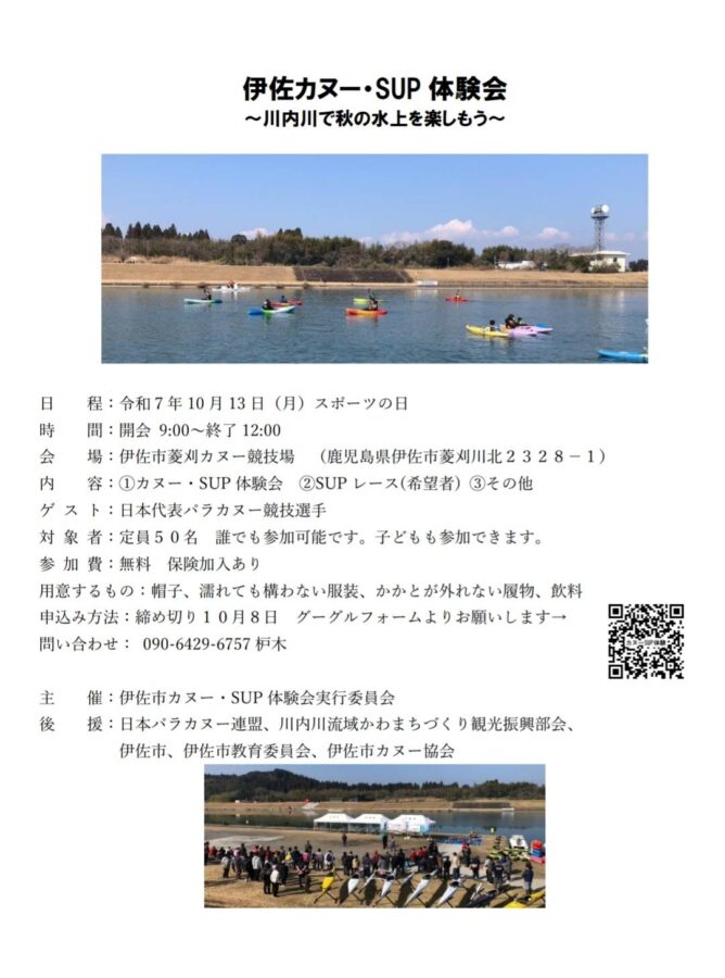 開催場所は2023年特別国民体育大会(かごしま国体)のカヌー(スプリント競技)の会場・伊佐市菱刈カヌー競技場です。参加はどなたでもOK!障がいの有無は問いません。カヌーやサップに乗るのが初めてでも大丈夫!当日は、サポートスタッフがお手伝いをするので、一緒に楽しめます!※未成年の方は必ず保護者の方とご一緒に来場ください。